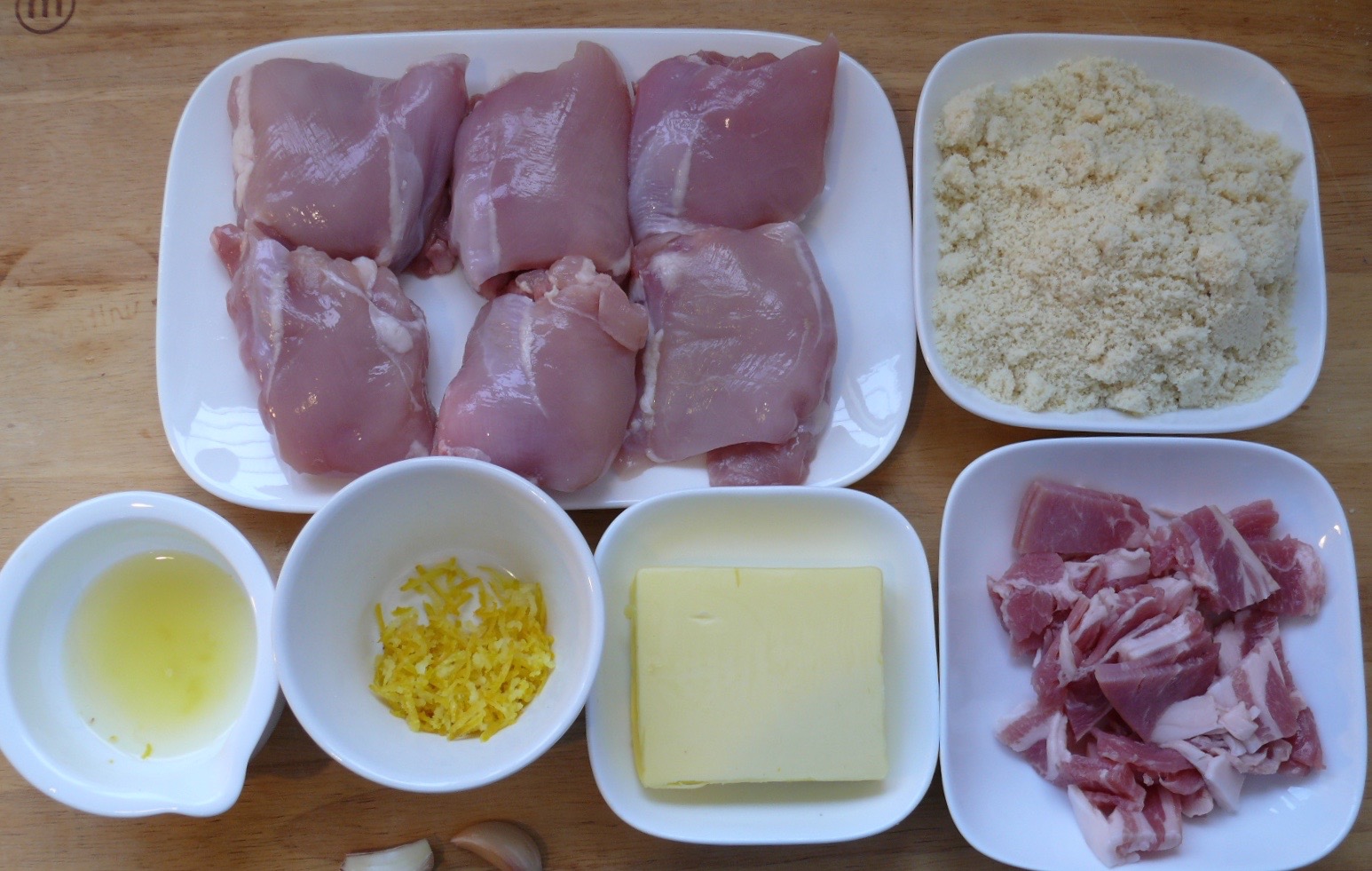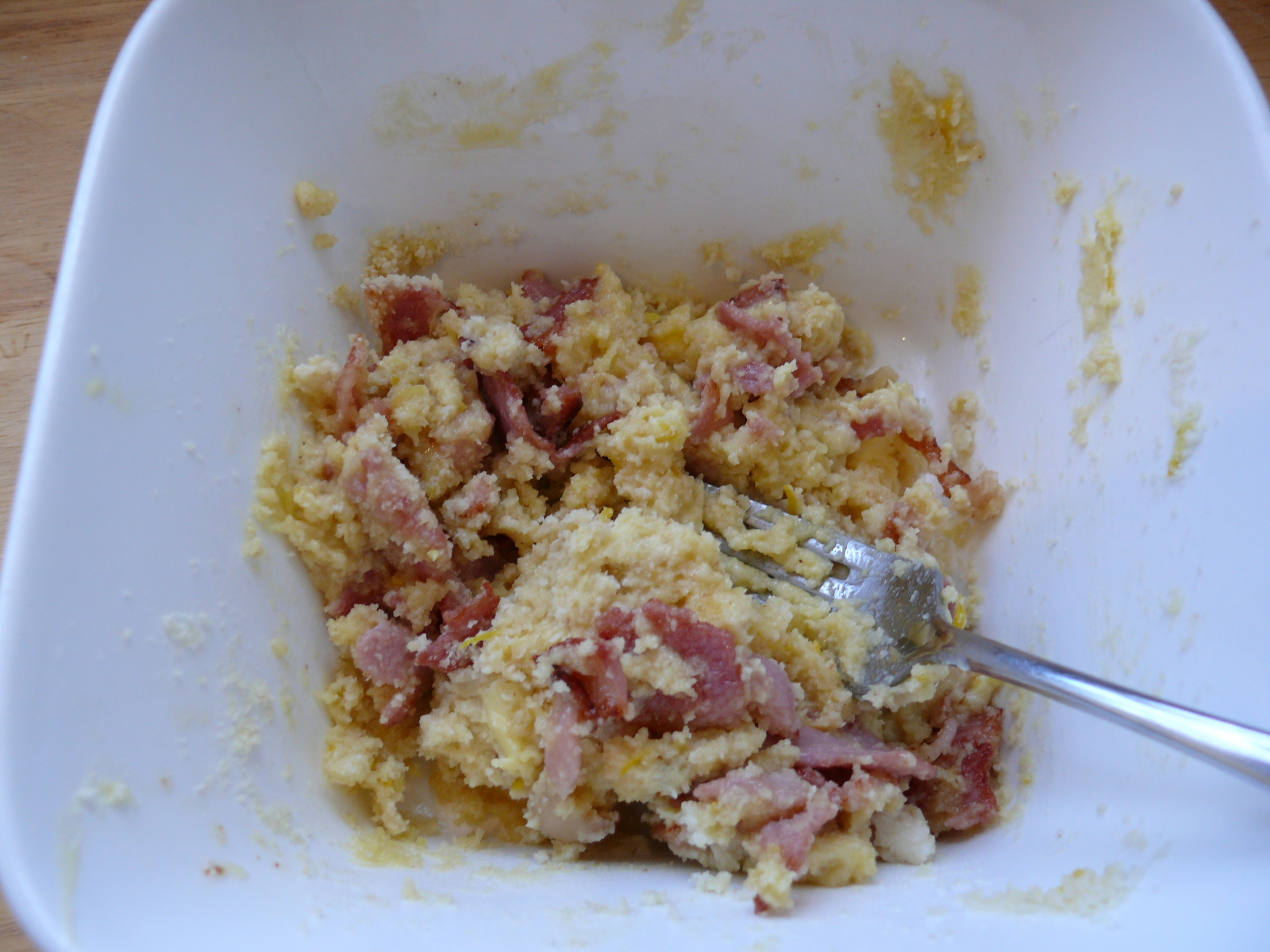 Mix cooled bacon with the almond meal, lemon zest and juice, butter, crushed garlic.