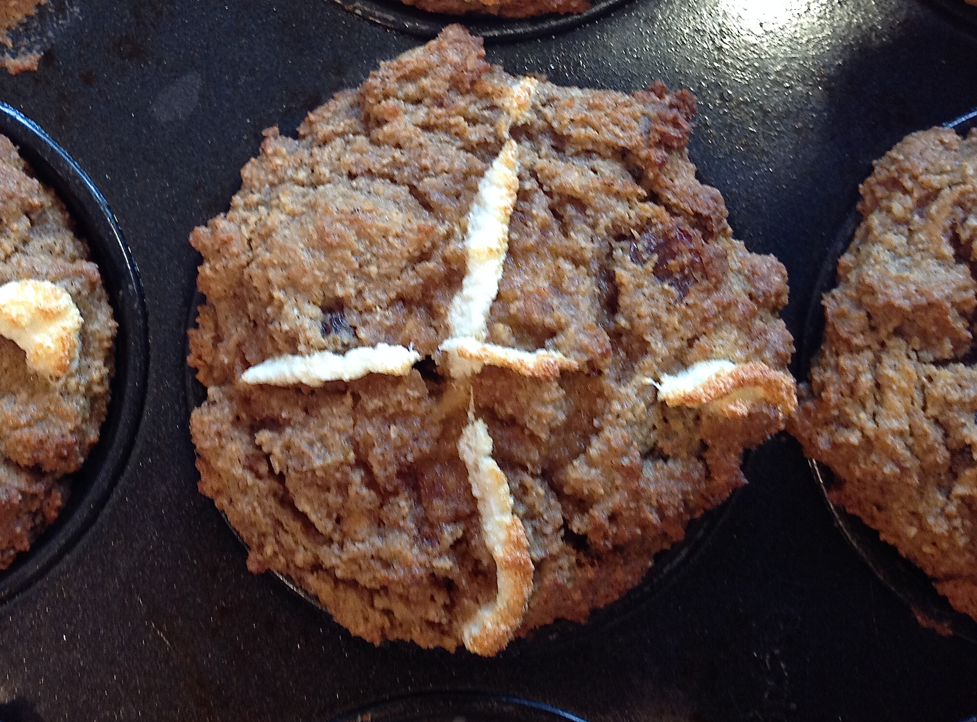 One a penny, two a penny, hot cross… muffins??? Well, I really can’t call these tasty treats, Hot Cross Buns – kinda defeating the purpose as we all know that true Hot Cross Buns are made from wheat flour and yeast. So in the interests of transparency I’m calling them like they are!
